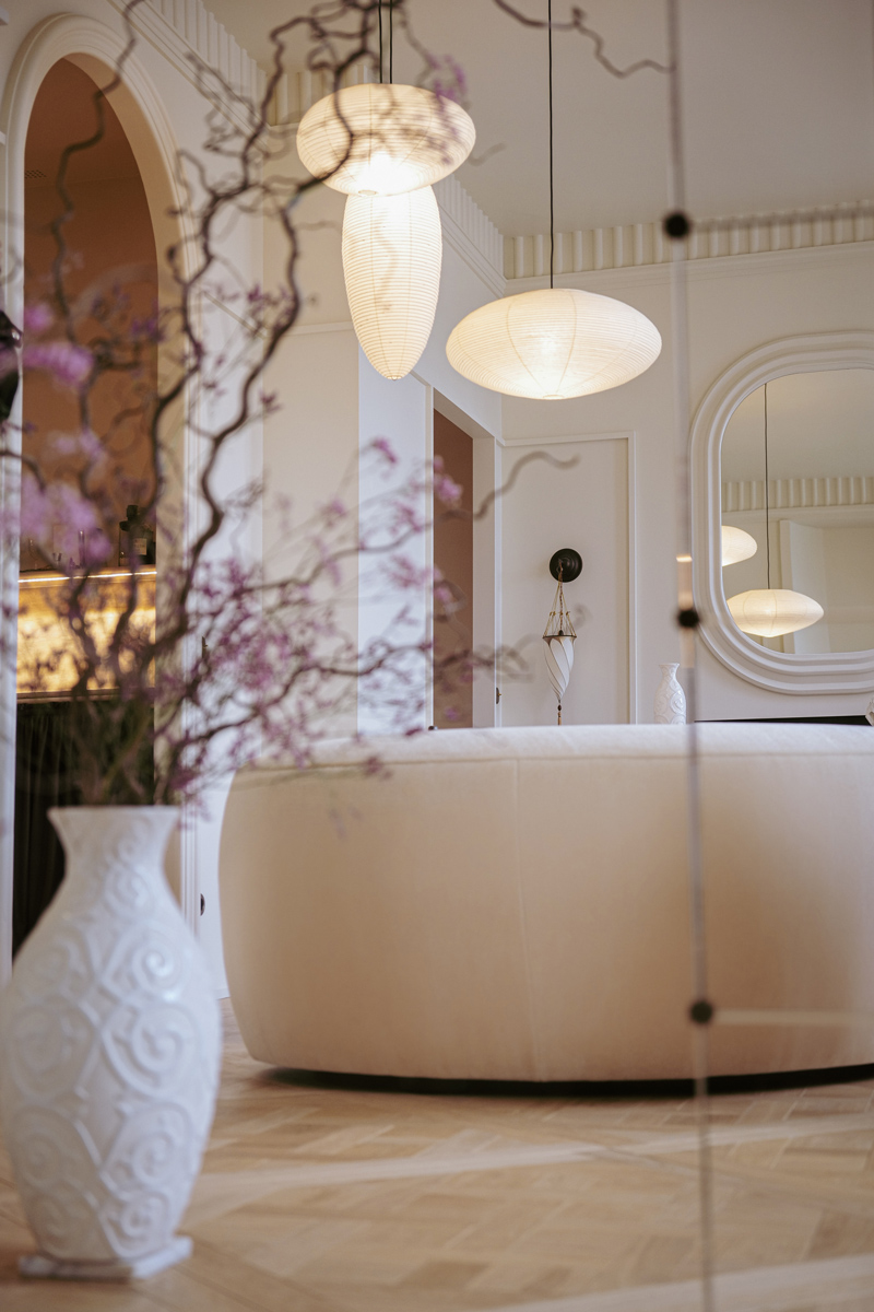 Nous avons également habillé le plafond d’une frise décorative en motif cannelé, façonnée en staff, pour sublimer les volumes tout en apportant une touche graphique et contemporaine. Les niches ont été réalisées en placo arrondi, afin de jouer avec les formes et la lumière.
